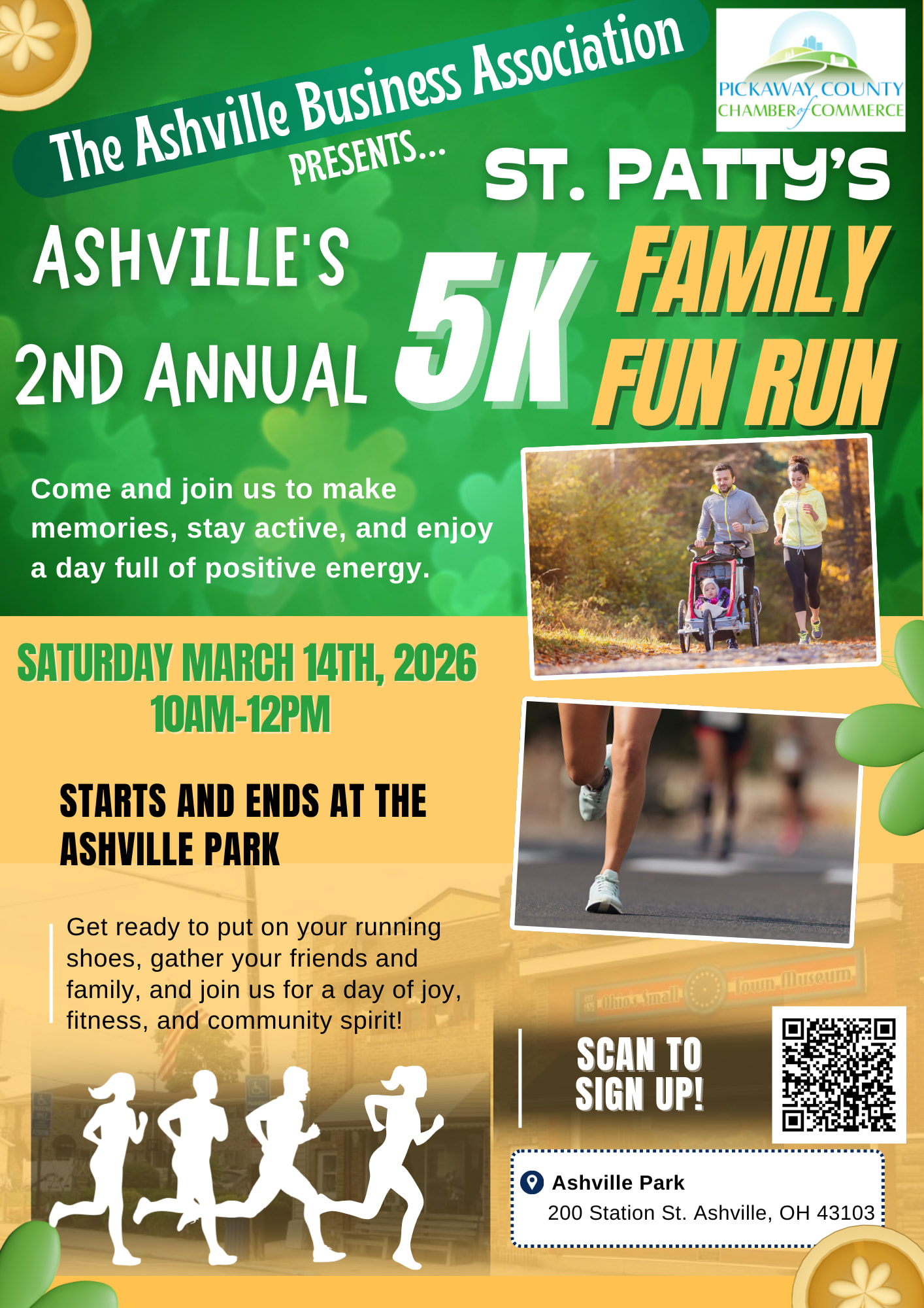 Join the Ashville Business Association for their 5k & Family Fun Run on Saturday, March 14th. The start and finish will be at the Park and the proceeds support a Local Cause.